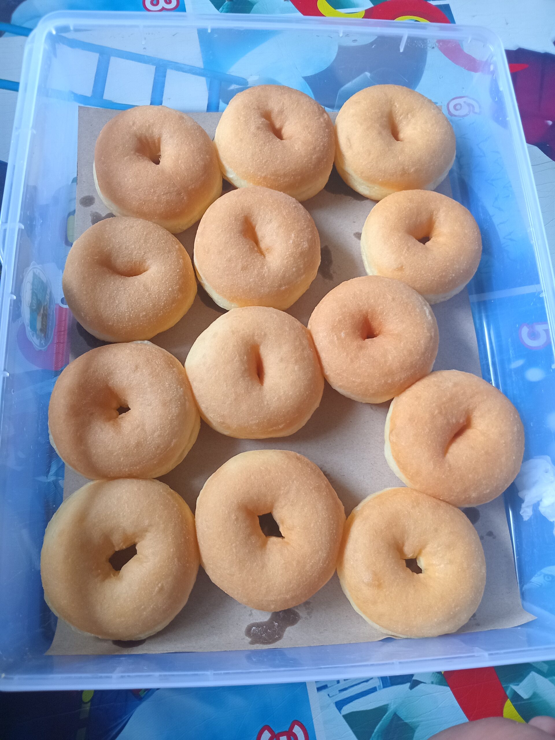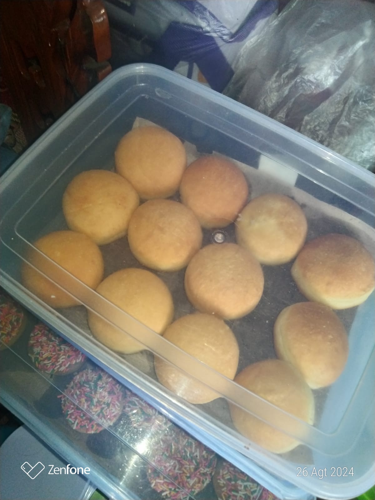 Donat klasik tabur gula halus yang lembut dan manisnya pas. Selalu jadi favorit semua kalangan, cocok untuk camilan sehari-hari atau sajian di acara keluarga.